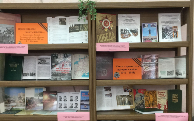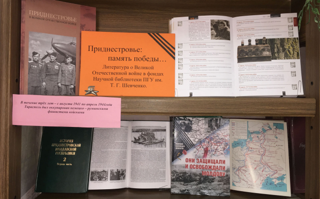В экспозиции представлены издания из фонда университетской библиотеки, рассказывающие об освобождении Тирасполя и о том, как жил город в годы Великой Отечественной войны, какие тяжкие испытания выпали на долю его жителей в период немецко-румынской оккупации.