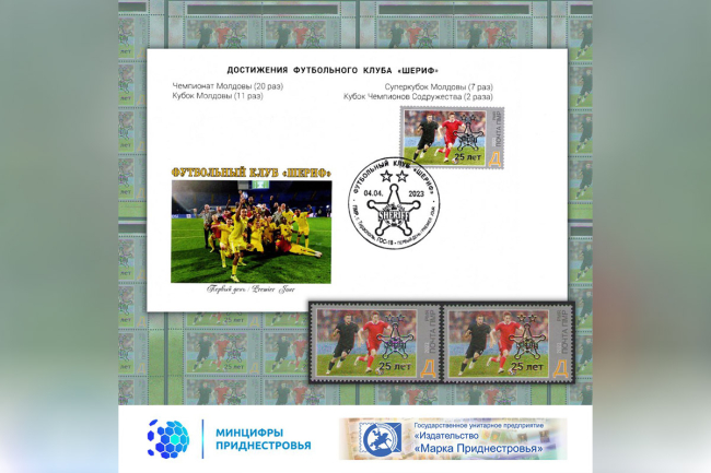 Тирасполь, 3 апреля. /Новости Приднестровья/. Ко дню рождения футбольного клуба «Шериф» издательством «Марка Приднестровья» выпущена серия памятных марок. Их спецгашение пройдёт 4 апреля в отделении связи № 18 ГУП «Почта Приднестровья», сообщает телеграм-канал Министерства цифрового развития, связи и массовых коммуникаций.