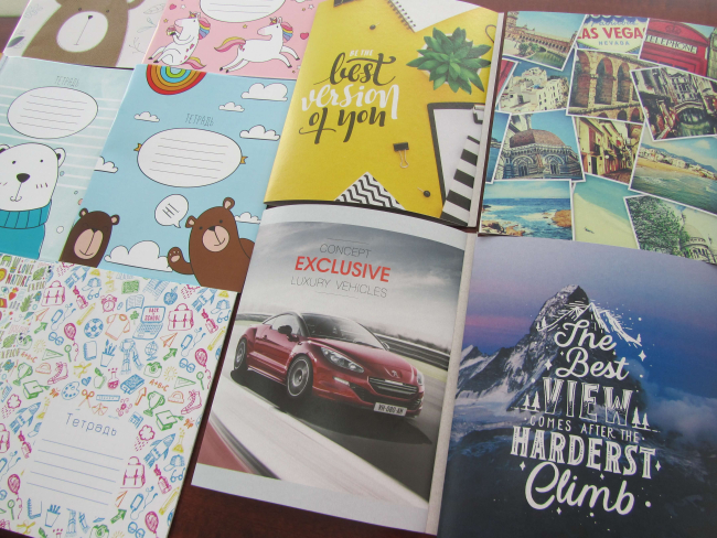 Для тетрадей выбрали рисунки, шрифты, орнаменты, абстракции, которые понравятся школьникам разных возрастов и студентам. Учли и гендерные предпочтения: есть обложки для мальчиков (автомашины, спорт) и девочек (цветы), общая тема – путешествия.