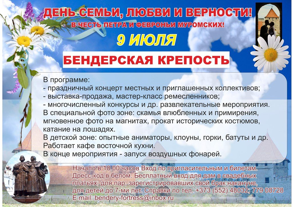 9 июля разноплановой праздничной программой отметят приднестровцы День семьи, любви и верности в Бендерах. Яркое мероприятие на территории Бендерской крепости организует администрация исторического военно-мемориального комплекса.