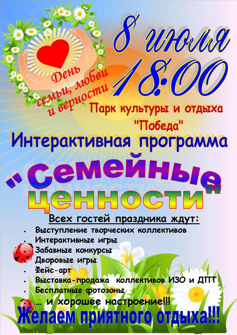 8 июля, в день семьи, любви и верности в столичном парке культуры и отдыха «Победа» будет организована интерактивная программа «Семейные ценности». Всех гостей праздника ждут: забавные конкурсы, дворовые игры, фейс-арт, бесплатные фотозоны, а также концертная программа тираспольских коллективов. Начало в 18:00.
