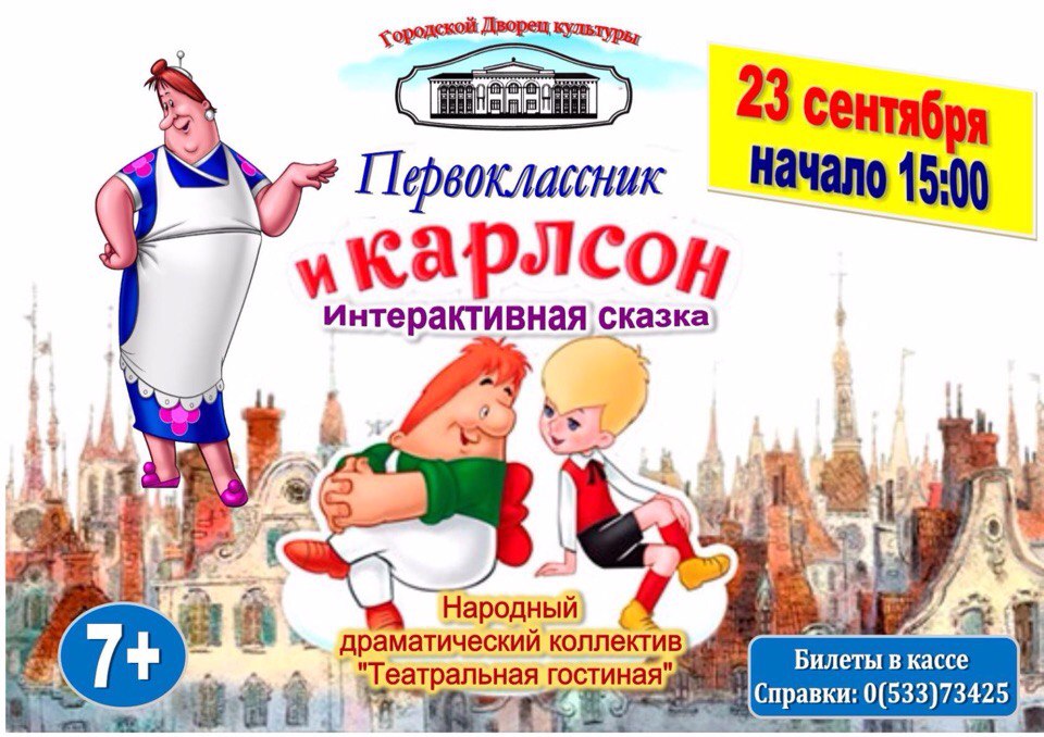 Городской Дворец культуры столицы приглашает на интерактивную сказку «Первоклассник и Карлсон». Народный драматический коллектив «Театральная гостиная» в рамках начала учебного года покажет, что учиться не только полезно, но и интересно. Начало в 15:00