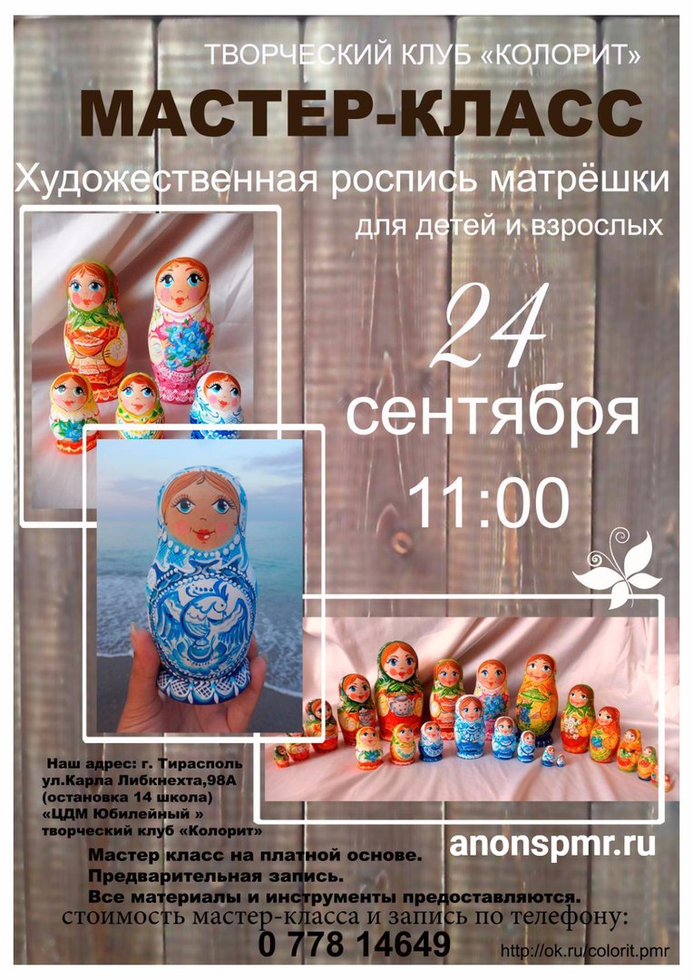 Творческий клуб «Колорит» проведет очередной мастер-класс в центре досуга молодежи «Юбилейный». Так, 24 сентября в 11:00 всех желающих научат художественной росписи матрешки.