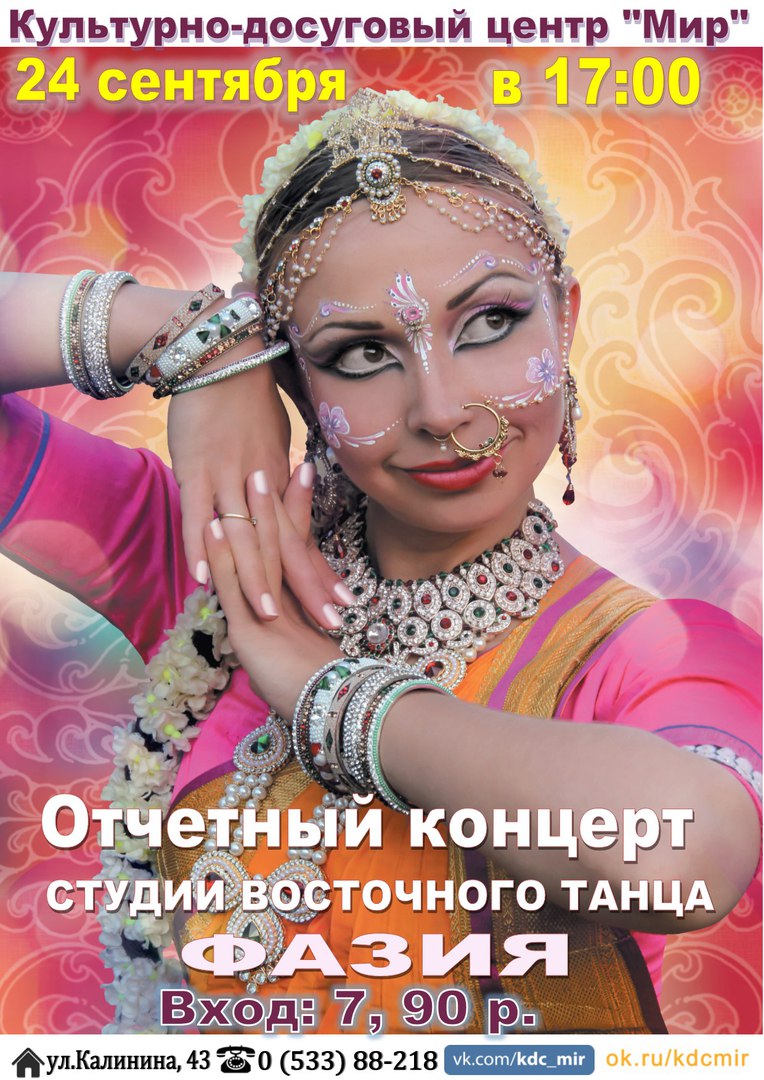 Затем в 17:00 состоится отчетный концерт студии восточного танца «Фазия». Билеты можно приобрести в кассе этого культурного учреждения.