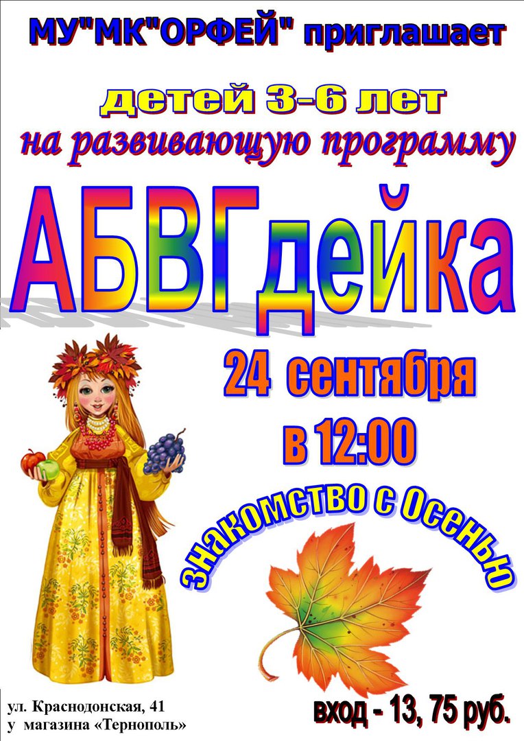 Также в воскресенье юные жители Тирасполя вместе с родителями могут посетить молодёжный клуб «Орфей», в котором проходит познавательная интерактивная программа «АБВГДейка». Малыши в возрасте от трех до шести лет узнают о том, какие буквы существуют в русском алфавите.