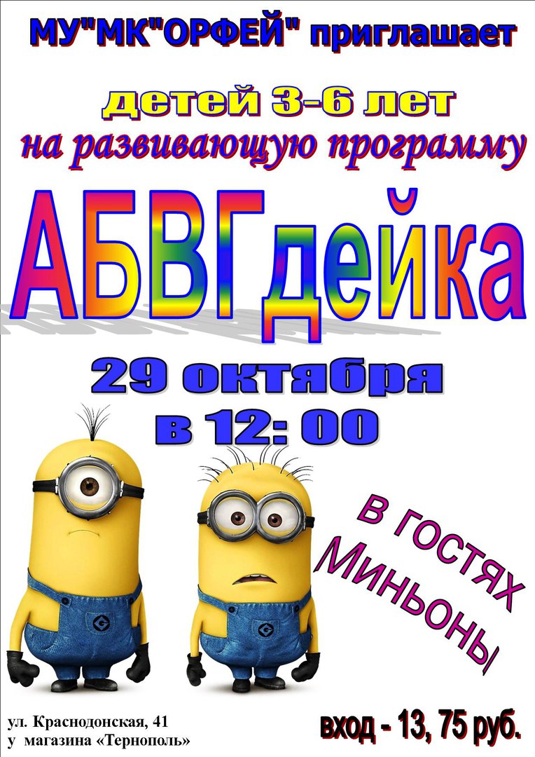 29 октября юные жители Тирасполя вместе с родителями могут посетить молодёжный клуб «Орфей», в котором проходит познавательная интерактивная программа «АБВГДейка». Малыши в возрасте от трех до шести лет узнают о том, какие буквы существуют в русском алфавите.