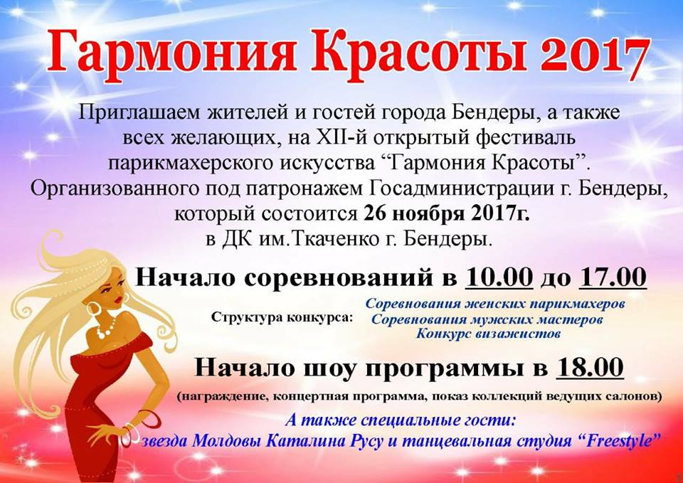 В этот же день в бендерском Доме культуры им. П. Ткаченко пройдет XII открытый фестиваль парикмахерского искусства «Гармония красоты». В нем примут участие женские и мужские парикмахеры, а также визажисты.