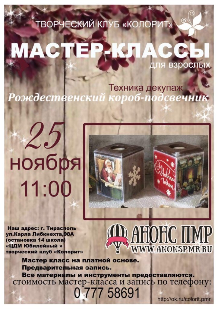 Столичный творческий клуб «Колорит» продолжает знакомить взрослых с поделками, которые можно сделать своими руками. В эту субботу они расскажут, как смастерить рождественский короб-подсвечник в технике декупаж.