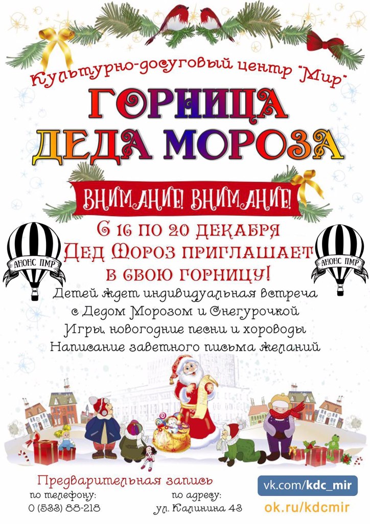 В эту субботу в столичном культурно-досуговом центре «Мир» начинает работать горница Деда Мороза. Каждому ребенку добрый волшебник уделит время: поговорит о поведении, послушает стихотворение и, конечно же, поводит хоровод.