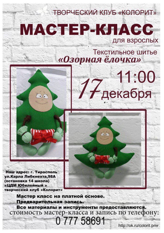 В воскресенье, 17 декабря, в центре досуга «Юбилейный» творческий клуб «Колорит» проведет мастер-класс по изготовлению «Озорной елочки» в технике текстильное шитье. Все материалы и инструменты предоставляются.