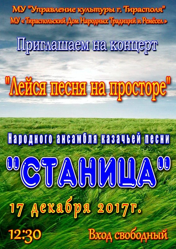 В этот же день в МУ «Тираспольский дом народных традиций и ремёсел» состоится отчётный концерт народного ансамбля казачьей песни «Станица» под названием «Лейся песня на просторе».