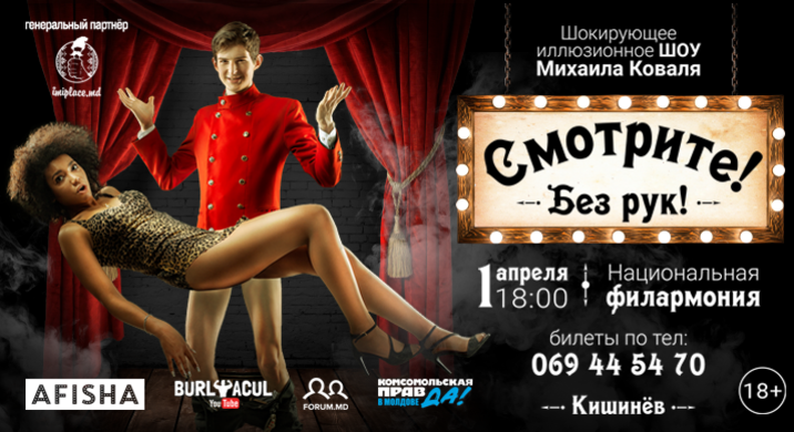 Если Вы хотите разнообразить свой досуг и выйти за рамки стереотипов, то шоу «Без рук» идеально подходит для Вас. Шокирующие иллюзионные номера можно увидеть 1 апреля в большом зале Национальной филармонии им. Сергея Лункевича (Кишинёв). Начало в 18:00.