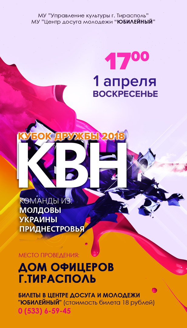 1 апреля в 17:00 в столичном Доме Офицеров пройдёт Международный открытый конкурс команд КВН. Юмористы из Приднестровья, Украины и Молдовы поборются за «Кубок дружбы».