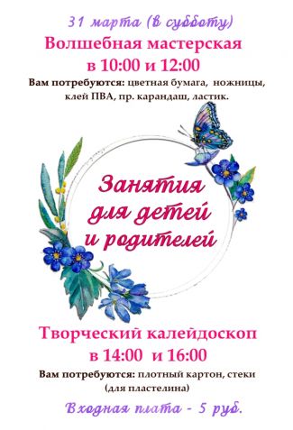 Приднестровский государственный художественный музей, расположенный в Бендерах, проводит занятия по проектам «Волшебная мастерская» и «Творческий калейдоскоп». Они рассчитаны на детей от 3 до 12 лет. Начало в 10:00, 12:00, 14:00 и 16:00. Стоимость одного занятия – 5 рублей.