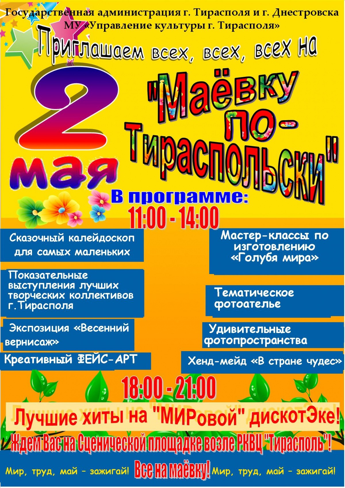 «Маевка по-тираспольски». На сценической площадке перед РКВЦ «Тирасполь» будут организованы большой концерт и зона для активного отдыха.