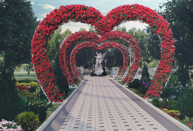 При входе в парк будут установлены три большие конструкции в форме сердца – символа любви, которые украсят цветами.
