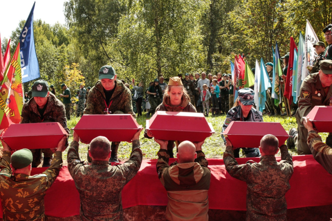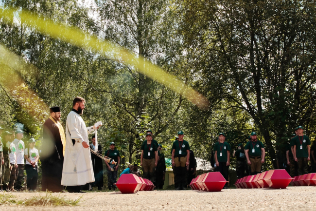 Первым мероприятием в рамках экспедиции стала церемония перезахоронения останков гражданского населения – жертв фашистского террора. Земле были преданы 124 мирных жителя деревни Крюково Калужской области, расстрелянных немцами в 1942 году. Среди жертв много детей и женщин.