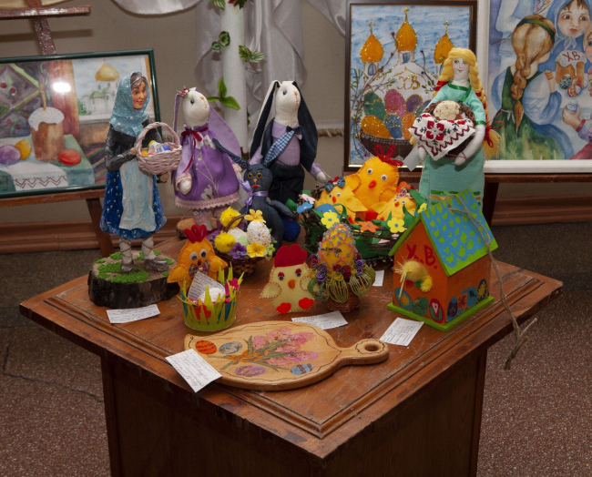В фойе Дома народных традиций и ремёсел, где прошло мероприятие, можно ознакомиться с лучшими работами участников конкурса. Здесь представлены пасхальные композиции, сувениры и открытки, корзины с крашенками и многое другое.
