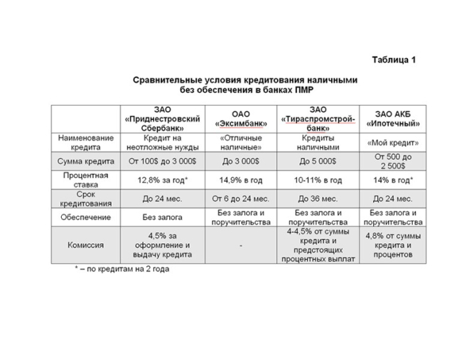 Для оценки того, что и почём нам предлагают, мы выберем наиболее востребованный вид кредитов – это кредиты наличными без обеспечения, и рассмотрим условия их предоставления (табл. 1).