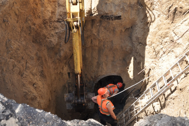 Коммунальщики трудятся в непростых условиях. Почти все работы по расчистке коллектора на данный момент ведутся вручную на глубине порядка 6 метров. Кроме того, в ремонте задействовано 4 единицы техники.