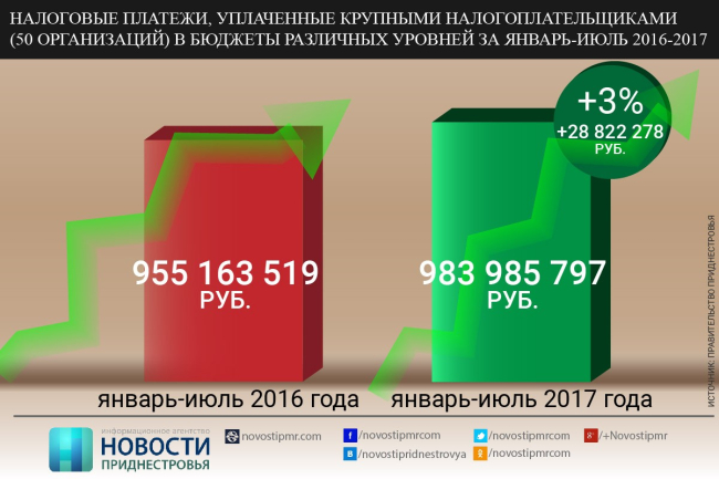 В целом за январь-июль 2017 года в бюджеты различных уровней от 50 крупных предприятий-налогоплательщиков поступило на 28,8 млн руб. или на 3,0% больше, чем в 2016 году.