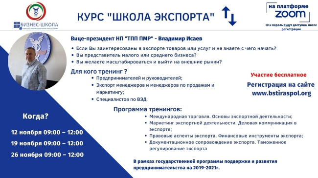Занятия пройдут онлайн на платформе Zoom 12, 19, 26 ноября с 9:00 до 12:00. В программе – основы и маркетинг экспортной деятельности, правовые аспекты, логистика и таможенное регулирование экспорта, а также другие темы.