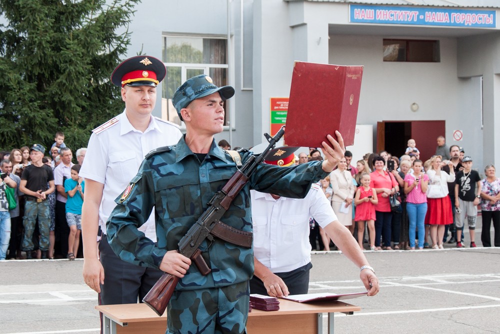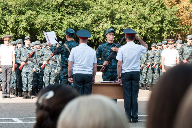 Торжественная церемония прошла в вузе сегодня утром. Слова воинской клятвы произнесли 88 первокурсников
