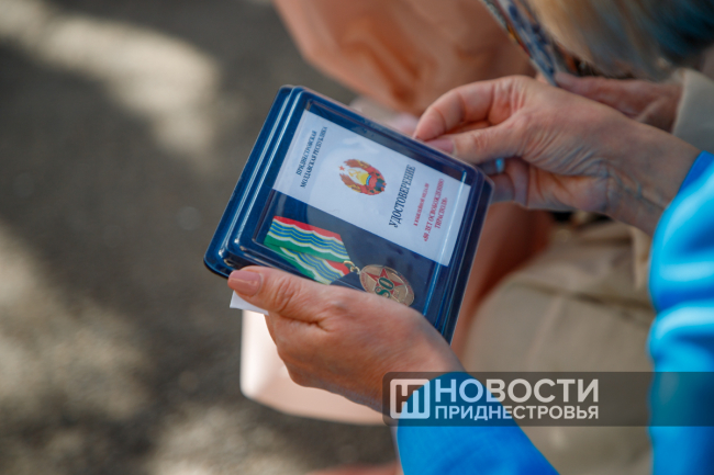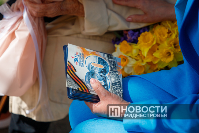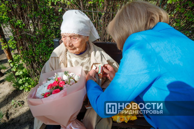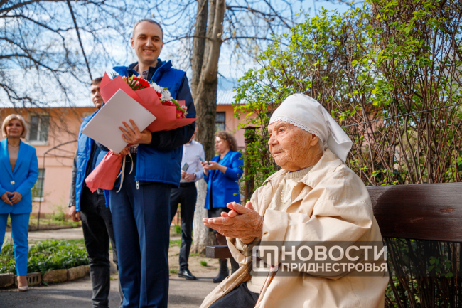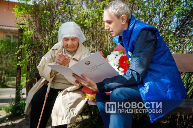 Координатор общественного движения «Волонтёры Победы. Приднестровье» Евгений Назаренко зачитал Марии Спиридоновне приветственный адрес от главы государства Вадима Красносельского. Президент отметил бесценный вклад ветерана в Победу над фашизмом. Представители столичной госадминистрации вручили имениннице медаль, выпущенную к 80-летию освобождения Тирасполя от фашизма, и подарки.