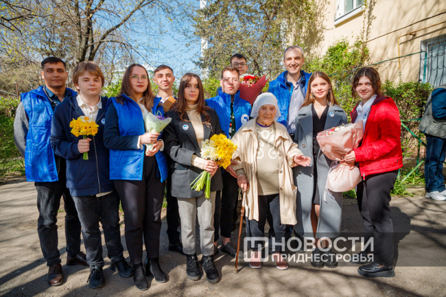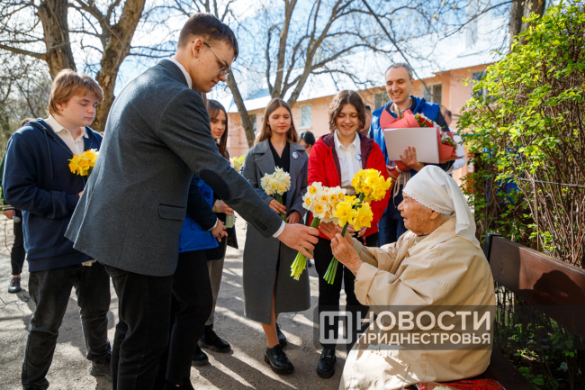 04 Апр., 2024, 13:50Тирасполь, 4 апреля. /Новости Приднестровья/. Ветеран Великой Отечественной войны Мария Казновская отмечает вековой юбилей. В этот теплый солнечный апрельский день именинницу пришли поздравить активисты общественного движения «Волонтеры Победы», замглавы госадминистрации Тирасполя по социальному развитию Стела Бай, представители тираспольского горсовета, УНО, совета ветеранов, школьный отряд волонтеров из столичной школы № 17. Встречу организовали у подъезда дома, где живет Мария Спиридоновна. Студенты приднестровского государственного Института искусств исполнили для именинницы ее любимые песни: «Катюшу», «Журавли», «Смуглянку».