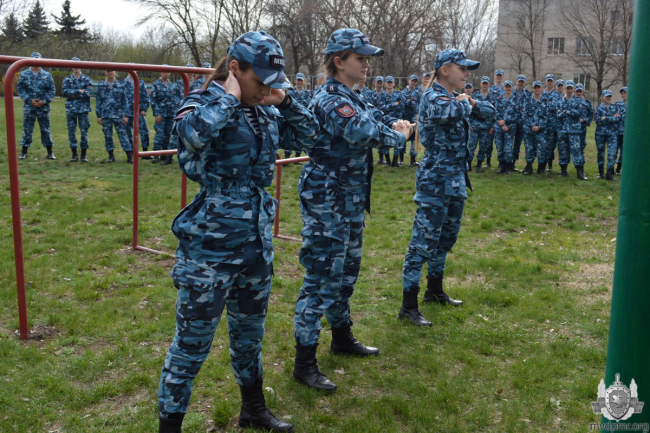 На спортивной площадке милицейского вуза курсанты под руководством спортсменов выполняли базовые упражнения воркаута: подтягивания, отжимания на брусьях и от пола. Девушки-курсантки отрабатывали правильную технику приседания.