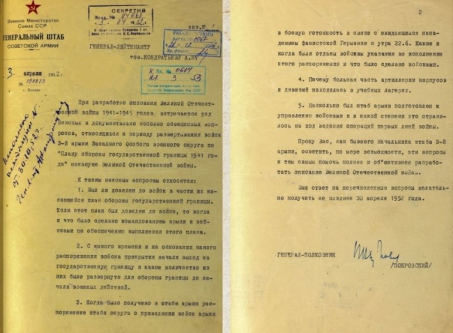 «Уникальные, ранее никогда не публиковавшиеся архивные документы содержат ответы командующих округами, армиями, командиров корпусов и дивизий, осуществлявших управление в первые дни войны, на пять ключевых вопросов, подготовленных Военно-историческим управлением Генерального штаба Советской Армии», — говорится в пресс-релизе.