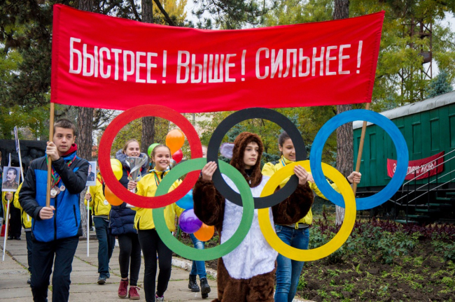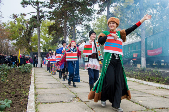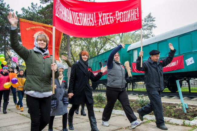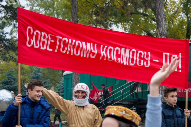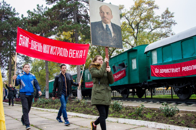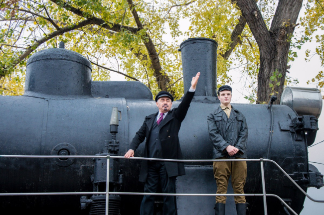Возле музея железнодорожников актёры изобразили ключевые моменты советской истории, а на знаменитом бендерском паровозе можно было увидеть Ленина