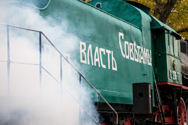 Началось мероприятия с того, что знаменитый паровоз начал выпускать пар и под звуки движущихся колёс из него выбежали люди в одежде той эпохи. Девушки и парни громко кричали: «Да здравствует Великая Октябрьская социалистическая революция!» и раздавали всем листовки. Затем перед собравшейся толпой появился вождь пролетариата Ленин, который произнёс знаменитую речь о том, что такое советская власть.