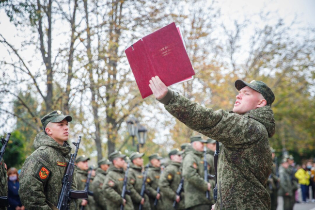 Тирасполь, 9 октября. /Новости Приднестровья/. Молодое пополнение осеннего призыва в торжественной обстановке приняло Военную присягу. По традиции церемонию начали с выноса Боевого знамени. Сразу после молодые бойцы с оружием в руках и перед своими командирами присягнули на верность Родине и поклялись достойно исполнять свой воинский долг, сообщает пресс-служба Минобороны ПМР.