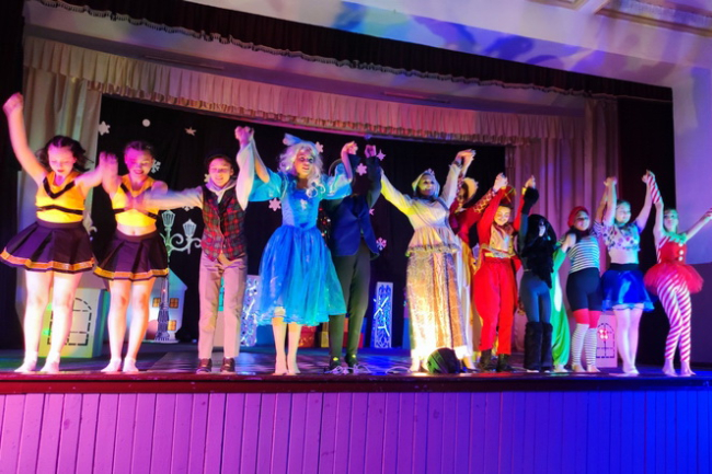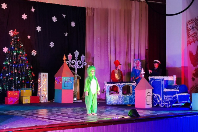 На сцене показали новогоднюю сказку «Путешествие синей стрелы». Спектакль подготовили артисты образцового драматического театра «Изумрудный город».
