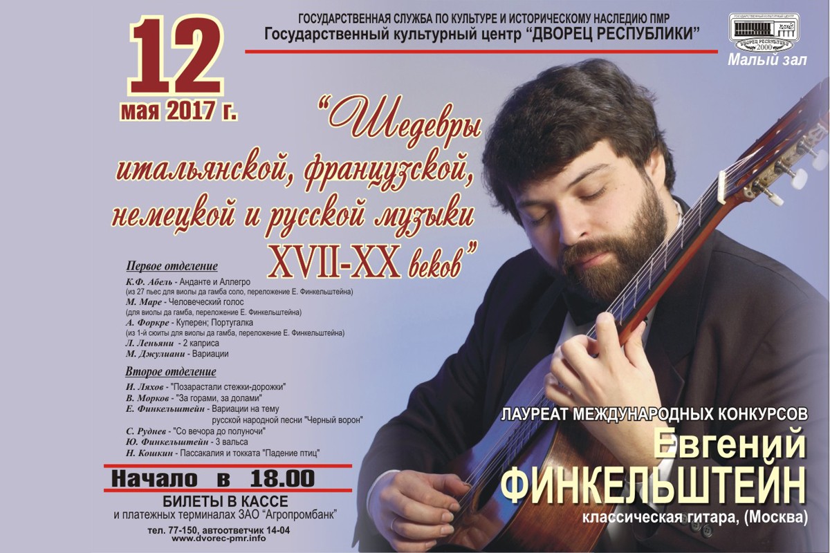 Тирасполь, 10 мая. /Новости Приднестровья/. Московский гитарист, лауреат международных конкурсов Евгений Финкельштейн, даст сольный концерт на большой сцене Дворца Республики. 12 мая в 18:00 музыкант исполнит шедевры итальянской, французской, немецкой и русской музыки XVII—XX вв.еков.