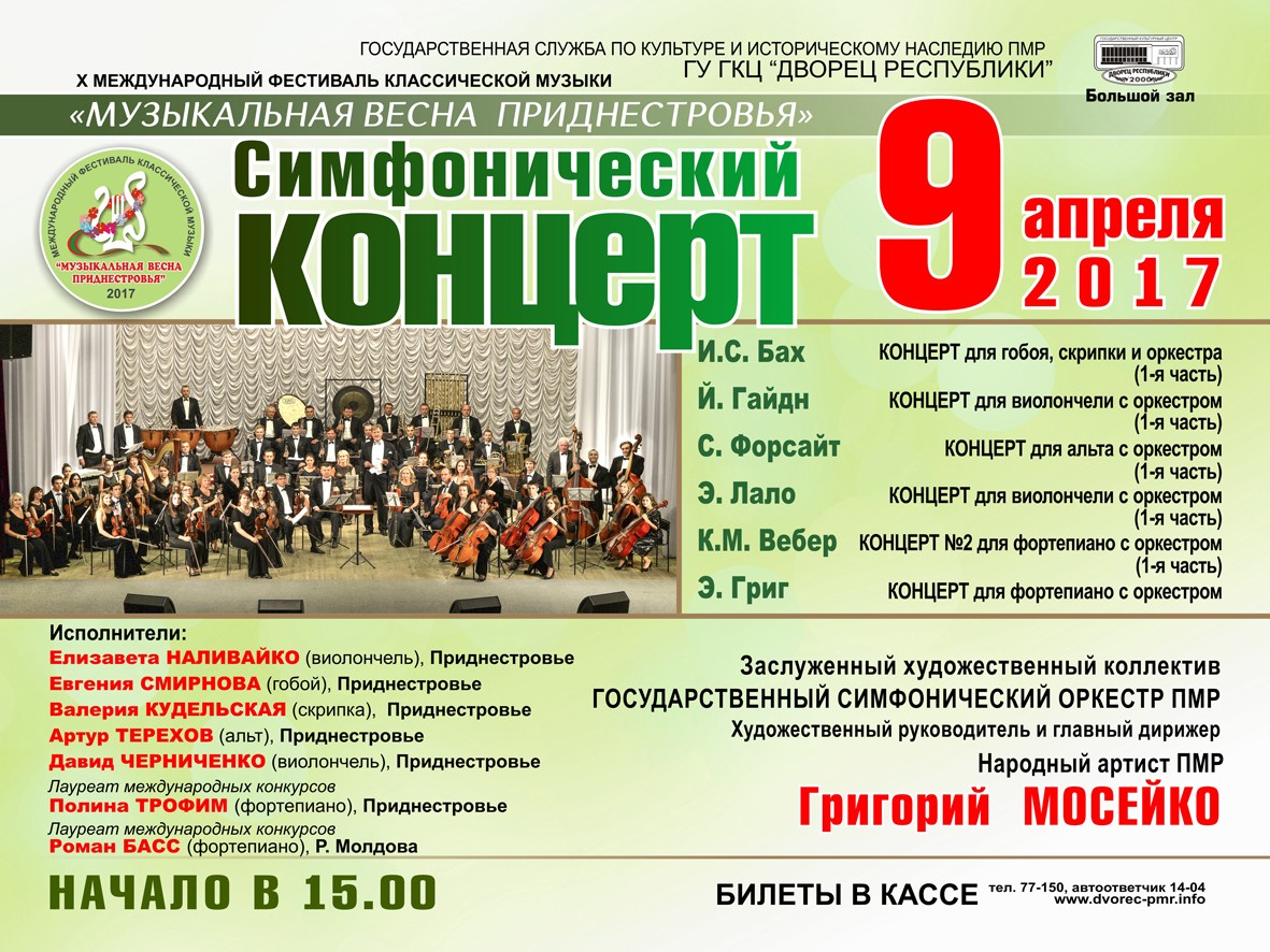 Завершится «Музыкальная весна Приднестровья» 9 апреля. В рамках большого заключительного концерта на одной сцене с Государственным симфоническим оркестром выступят студенты Приднестровского государственного института искусств, а также известный молдавский фортепианист Роман Басс. В этот вечер будут исполнены произведения Иоганна Себастьяна Баха, Йозефа Гайдна, Сесила Форсайта, Эдуара Лало, Карла Вебера и Эдварда Грига.