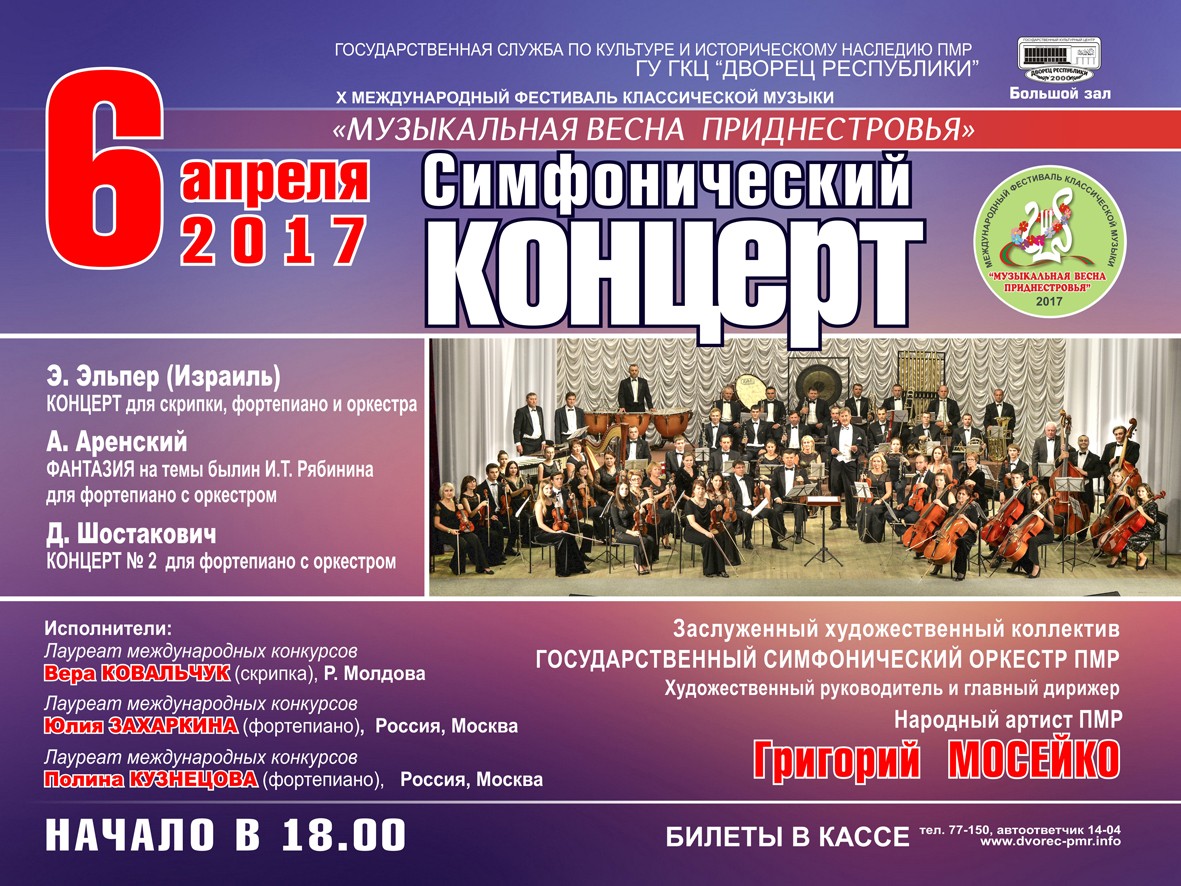 Тирасполь, 5 апреля. /Новости Приднестровья/. Завтра, 6 апреля, в большом зале Дворца Республики состоится выступление Государственного симфонического оркестра ПМР в рамках Х Международного фестиваля классической музыки «Музыкальная весна Приднестровья».