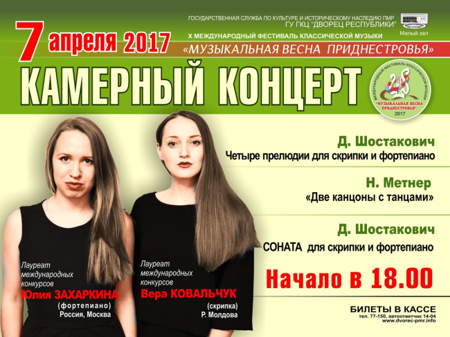 Затем, 7 апреля, также во Дворце Республики пройдёт камерный концерт приглашенных гостей: российской фортепианистки Юлии Захаркиной и молдавской скрипачки Веры Ковальчук. Они исполнят произведения Шостаковича «Четыре прелюдии для скрипки и фортепиано», «Соната для скрипки и фортепиано», а также «Две канцоны с танцами» Метнера.