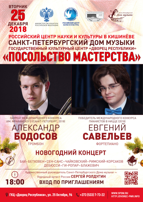 Тирасполь, 17 декабря. /Новости Приднестровья/.  В преддверии Нового года Санкт-Петербургский Дом музыки в рамках проекта «Посольство мастерства» представит в Тирасполе камерный концерт. Лауреаты престижных международных конкурсов Александр Бодосов (тромбон) и Евгений Савельев (фортепиано) исполнят праздничные композиции русских и зарубежных композиторов.