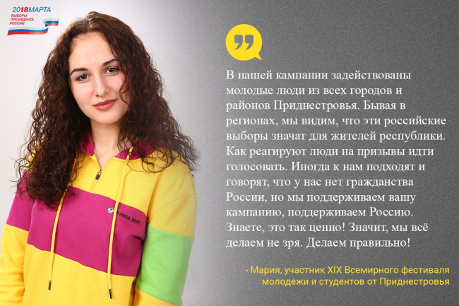24 Фев., 2018, 09:1118 марта 2018 г. в Российской Федерации пройдут выборы Президента. В Приднестровье будут открыты 24 избирательных участка. В республике сегодня проживают порядка 220 тысяч граждан РФ. В связи с этим участники XIX Всемирного фестиваля молодежи и студентов от Приднестровья проводят с 20 февраля по 18 марта 2018 г. Республиканскую информационную кампанию «Приднестровье голосует вместе с Россией. Россия в моем сердце!».