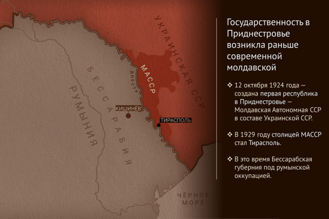 Тирасполь, 5 декабря. /Новости Приднестровья/. Основа государственности Приднестровья - МАССР, созданная в 1924 году, когда территория нынешней Молдовы была ещё аннексирована Румынией. Первая республика в Приднестровье со столицей в Тирасполе стала ядром новой союзной республики - Молдавской ССР, искусственно созданной в 1940 году, когда Советский Союз вернул контроль над бывшей Бессарабской губернией Российской империи. Тогда же, в 1940 году, столицу перенесли в Кишинёв. Через 50 лет, в 1990 году, националисты провели через Верховный Совет МССР постановление, которым признали незаконным создание этой союзной республики. Это означало юридический отказ от Приднестровья. Факт из истории привел Президент ПМР Вадим Красносельский на открытом уроке для школьников и студентов.