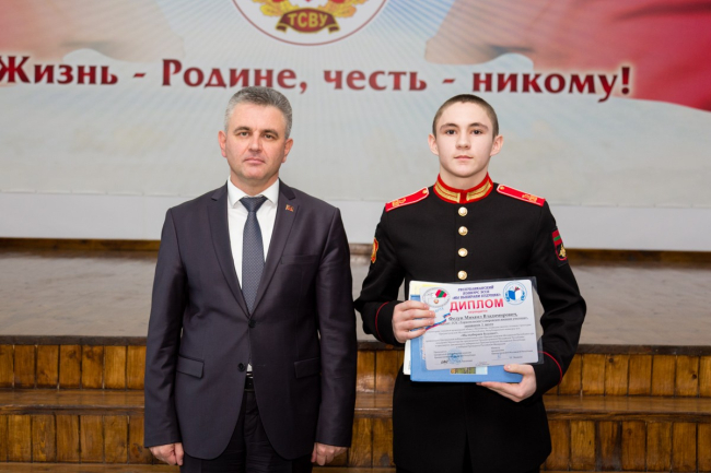Из рук президента памятные дипломы и ценные подарки получили победители конкурса эссе среди организаций, подведомственных силовым структурам республики.  Среди них был и суворовец Михаил Федун. Его творческая работа была признана лучшей.