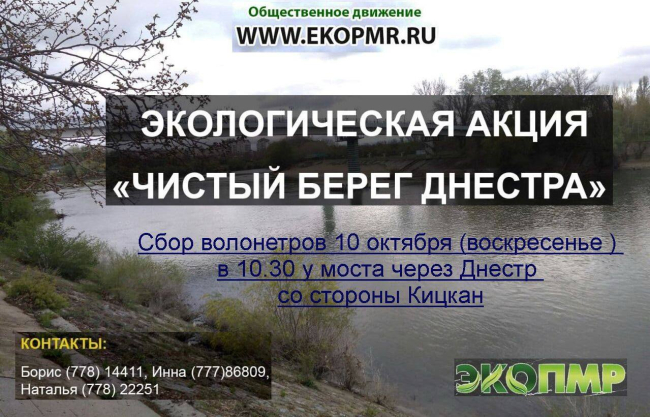 Всех активных и неравнодушных тираспольчан, желающих принять участие в наведении порядка, ждут в воскресенье, 10 октября, у моста через Днестр со стороны села Кицканы.