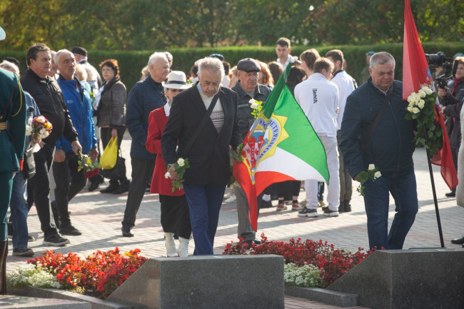 Корзина гвоздик у Вечного огня от Президента ПМР Вадима Красносельского, живая цветочная россыпь у могильных плит и постаментов памятников. Церемонии возложения цветов на столичном мемориальном комплексе – неизменная традиция празднования значимых для города и страны дат, говорится на сайте главы государства.