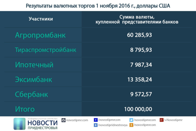 Тирасполь, 1 ноября. /ИА «Новости Приднестровья»/. Как сообщает Отдел общественных коммуникаций ПРБ, совокупный спрос на торгах валютного аукциона Приднестровского республиканского банка 1 ноября 2016 года составил в эквиваленте 42 716 063.63 долларов США.