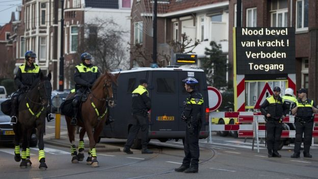 Протестующие, как пишет BBC, собрались у консульства после того, как власти Нидерландов не разрешили двум турецким министрам — сначала главе МИД Турции Мевлюту Чавушоглу, а позже министру по делам семьи и социальной политики Турции Фатиме Бетюль Саям Кайе — встретиться с проживающими в Роттердаме согражданами.