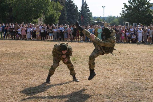 Рота Почетного караула продемонстрировала зрителям мастерство строевой выучки, а военнослужащие армейского спецподразделения – навыки рукопашного боя и приемы обращения с образцами штатного вооружения.