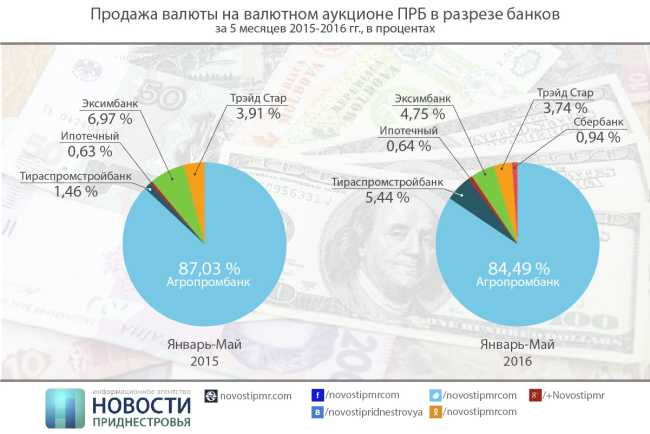 Также отмечается, что в 4-м квартале 2015 года 98,5% всей проданной валюты Приднестровским республиканским банком на валютном аукционе ПРБ было куплено клиентами ЗАО «Агропромбанк», за 5 месяцев текущего года - 84,5% валюты, в аналогичном периоде 2015 г. – 87,03%.