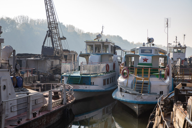 Ещё в речном порту есть «караван». Так называется скопление судов, которые находятся в порту в зимнее время. До начала сезона за ними смотрят сотрудники предприятия, а некоторые плавстредства при необходимости ремонтируют.